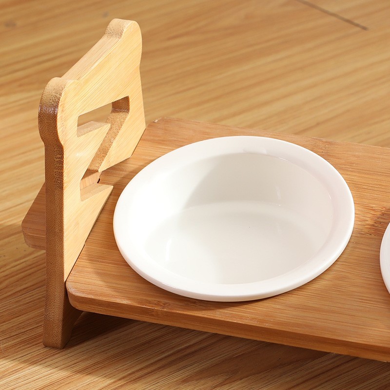 高腳竹架連陶瓷斜口寵物雙碗 14cm