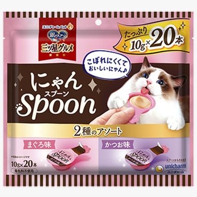 日本 Unicharm 貓小食 銀湯匙三星 吞拿魚拼鰹魚 2味肉醬10g X20本 (UIC-3675)(粉紅紫)