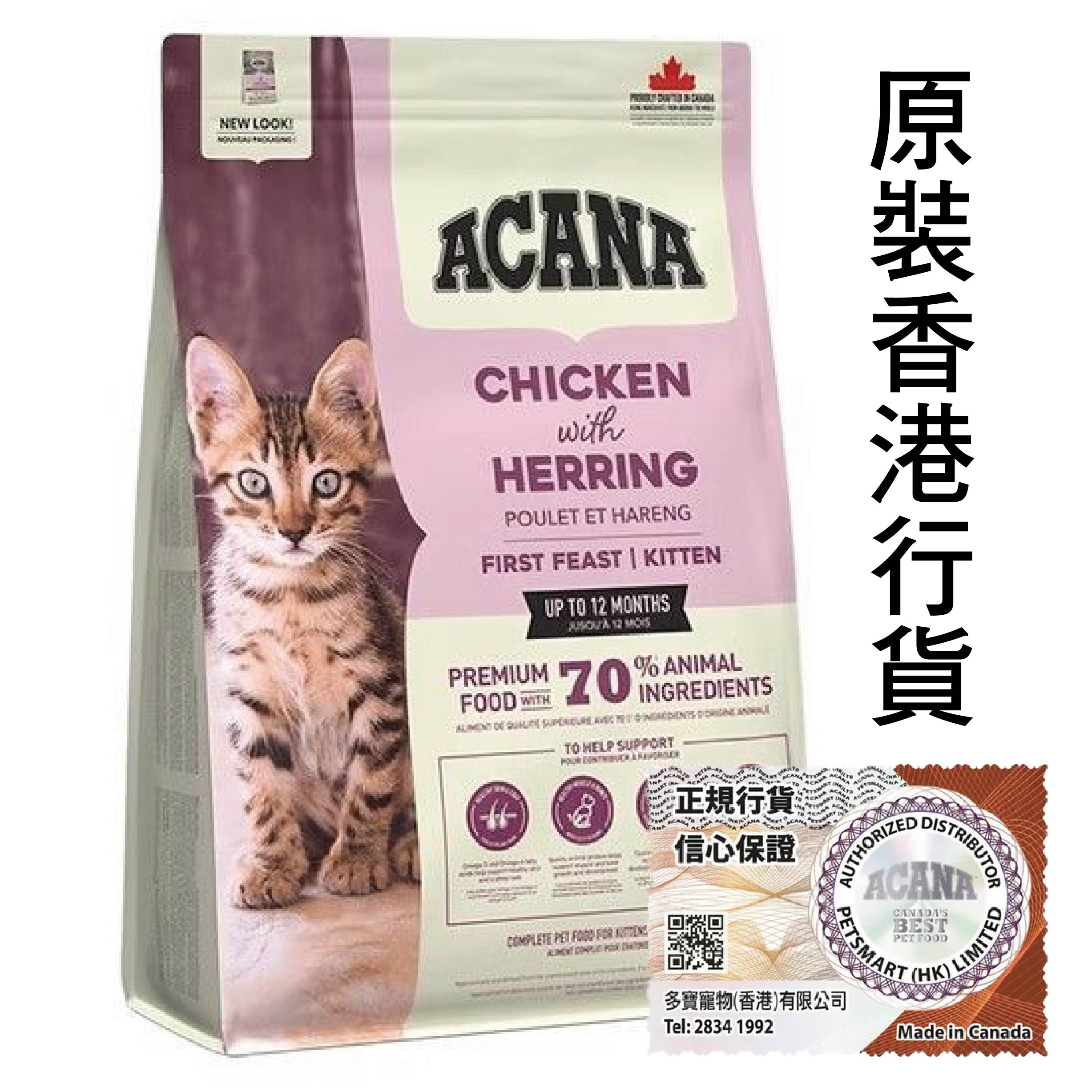 ACANA FIRST FEAST 幼貓配方 (雞肉燕麥),70% 優質肉含量,豐富動物性營養成分,提供幼貓發育和成長所需營養。使用放養新鮮雞肉、火雞肉、鯡魚、鵪鶉肉及新鮮巢蛋,加上 30% 新鮮蔬果與草本植物,給予您的愛貓一場營養美味的盛宴。