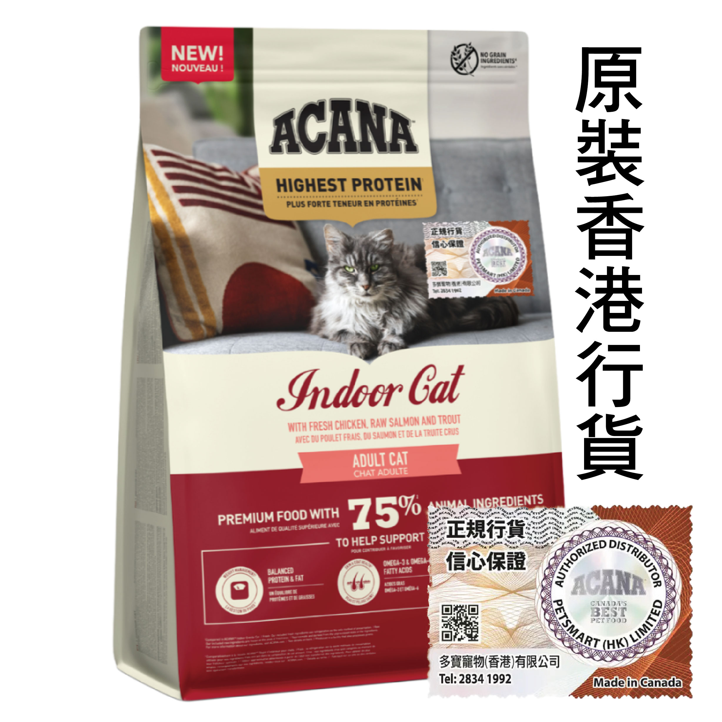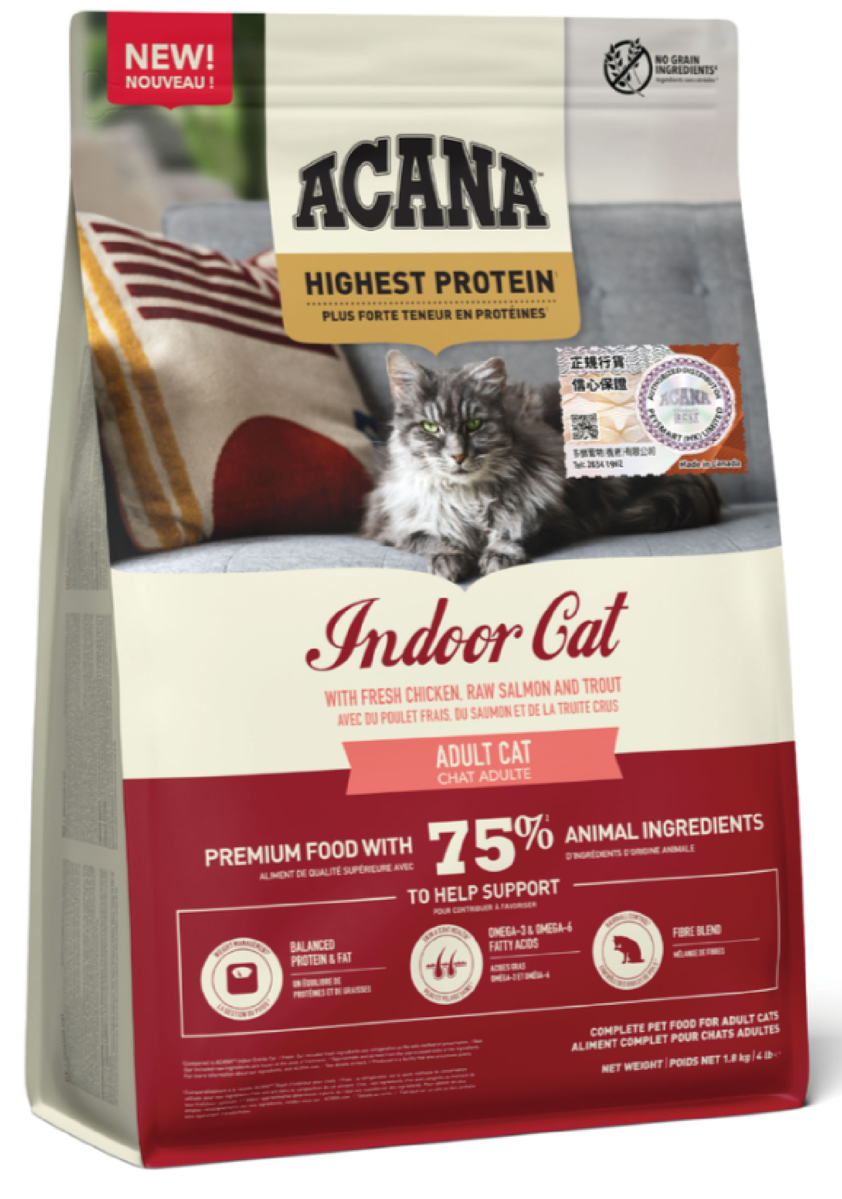 ACANA 最高蛋白質室內貓配方專為滿足室內貓的獨特需求而配製。這種優質配方不添加穀物,旨在滿足貓科動物對優質蛋白質的渴望,並支持它們的健康和生活方式。