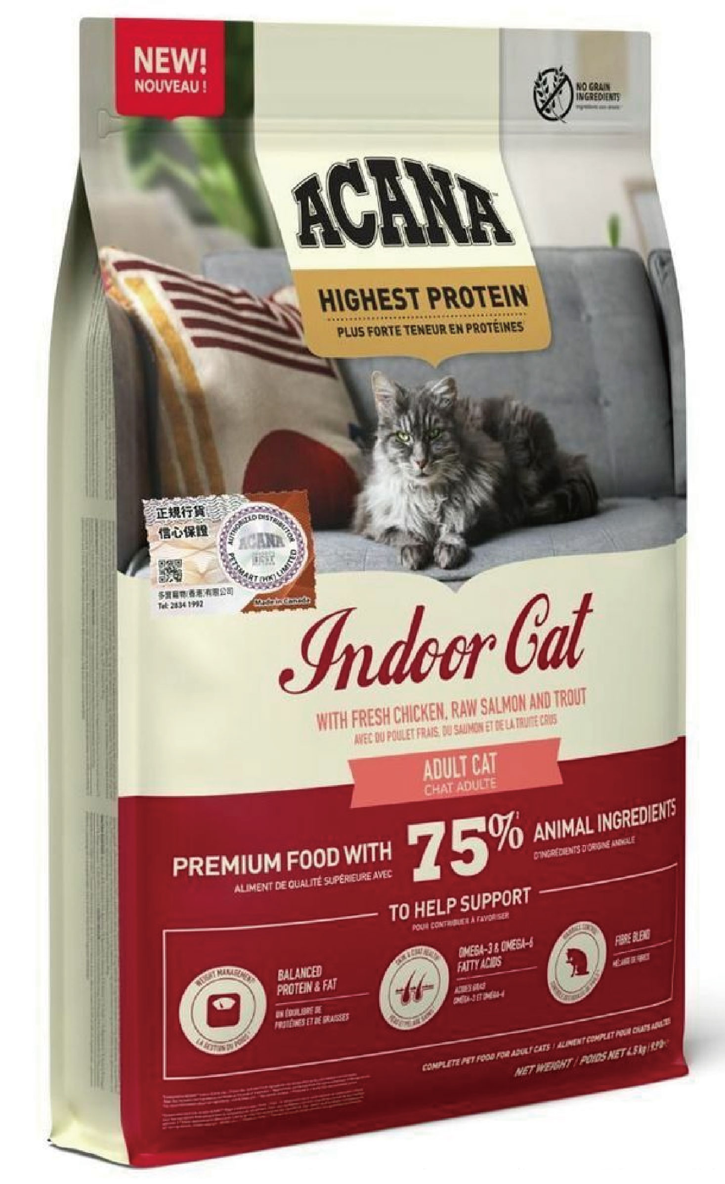 ACANA 最高蛋白質室內貓配方專為滿足室內貓的獨特需求而配製。這種優質配方不添加穀物,旨在滿足貓科動物對優質蛋白質的渴望,並支持它們的健康和生活方式。