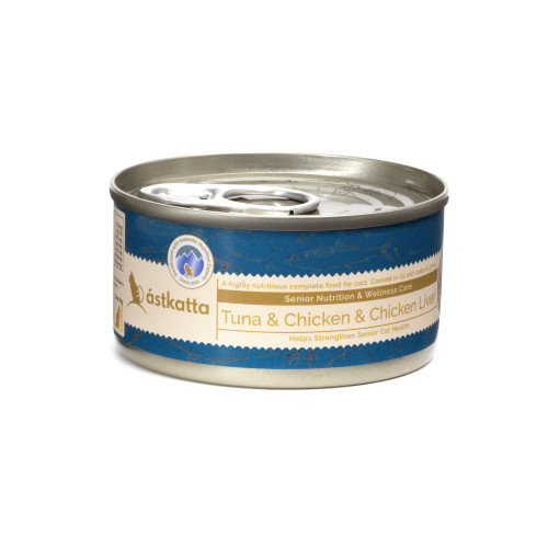 [$324/24罐]Astkatta 無膠主食貓罐頭(肉絲) 吞拿魚&雞肉&雞肝 (高齡貓) 80g (深藍)