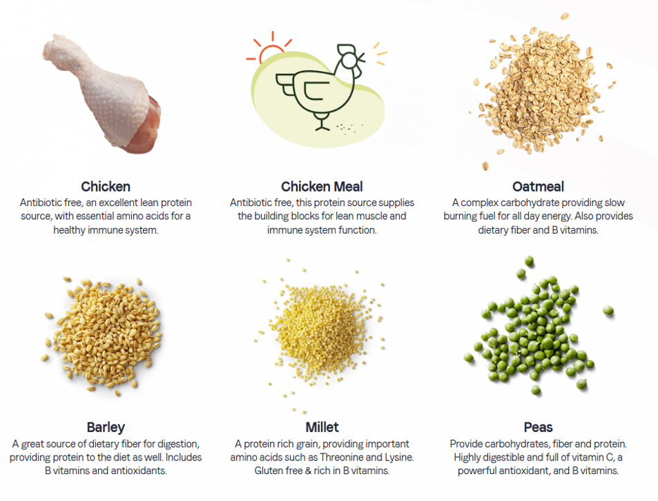 以不含抗生素的雞肉為主要原料,搭配燕麥、大麥、高粱和小米等古老穀物。