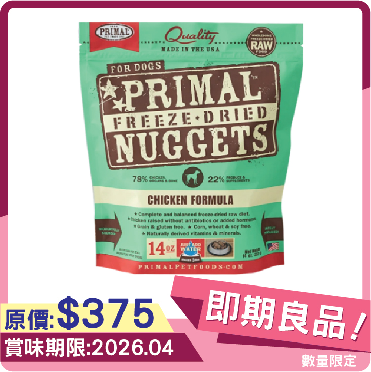 [特價品]Primal 凍乾脫水狗糧 雞肉 (大粒) 14oz CCF14FD (綠) (舊包裝)[EXP:2026.04]