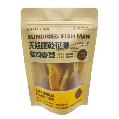 花膠含大量骨膠原,豐富蛋白質,亦含有多種維他命及礦物質,包括鈣、鋅、鐵、硒等,有滋陰,固益精,對肺腎擂弱,貧血等均有功效,對毛孩有良好食療作用。花膠含有高黏性膠體蛋白和黏多糖物質,對皮膚尤其重要,有養顏活血的功效。而且花膠不含膽固醇,可長期食用,是非常有益的養生食材,貓狗均可食用。而狗狗還可以直接吃乾花膠來當高級健瞑的天然潔齒骨。