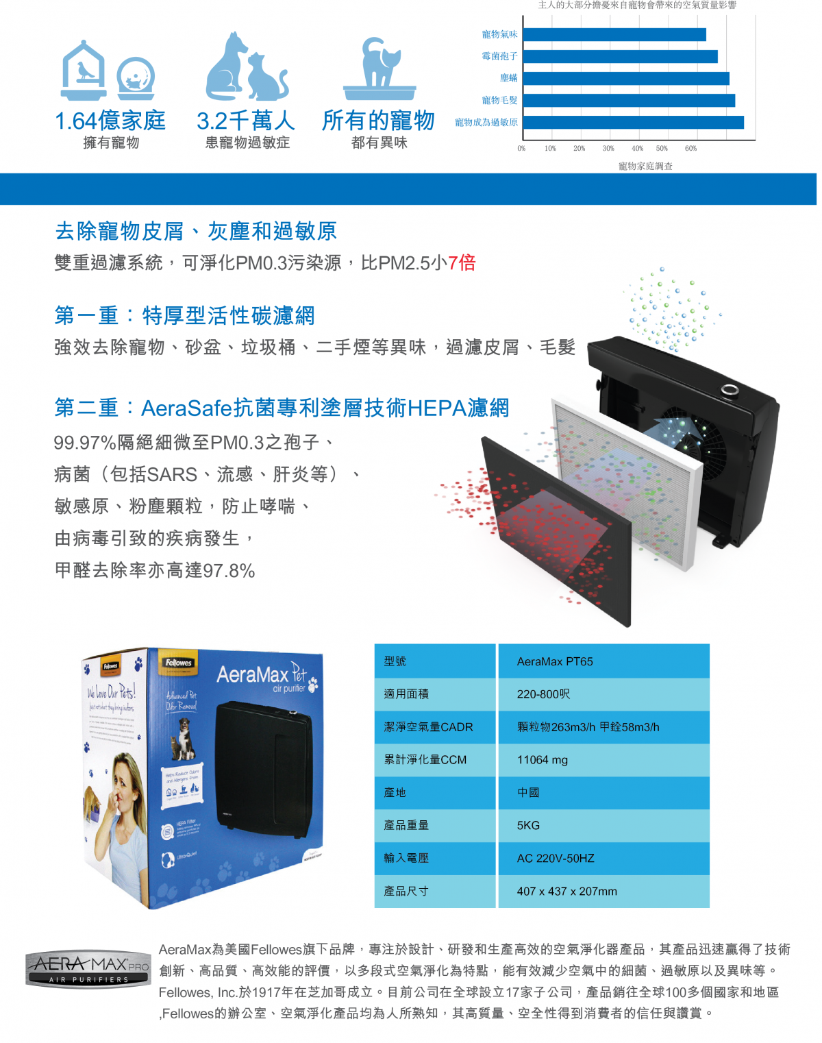 AeraMax PT65 寵物專用空氣淨化機 ,強效去除寵物產生之異味、吸毛、高效淨化99.97%細菌病毒及敏感源,保護家人健康,敏感飼主恩物。備有三段風速,低檔靜音模式適合睡眠使用。