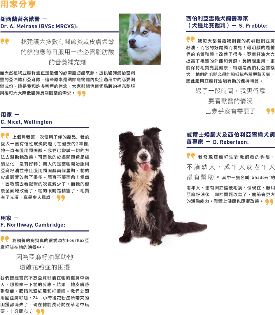 紐西蘭的亞麻籽油,是經科學驗證含有豐富的OMEGA3,6,9 及維他命E 對您的愛犬有以下的幫助: