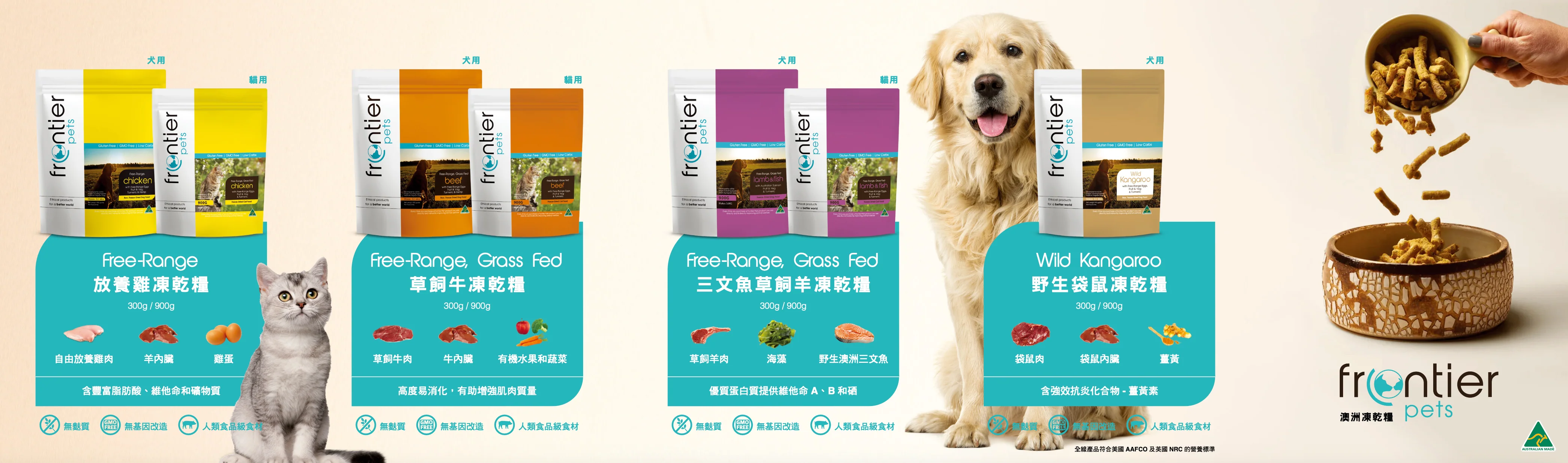 Frontier 悅緻原凍 來自天然純淨的澳洲,也是目前澳洲評價最高的寵物生食凍乾之一,嚴選高品質100%放養牛肉、雞隻、野豬等新鮮鮮肉原肉!
