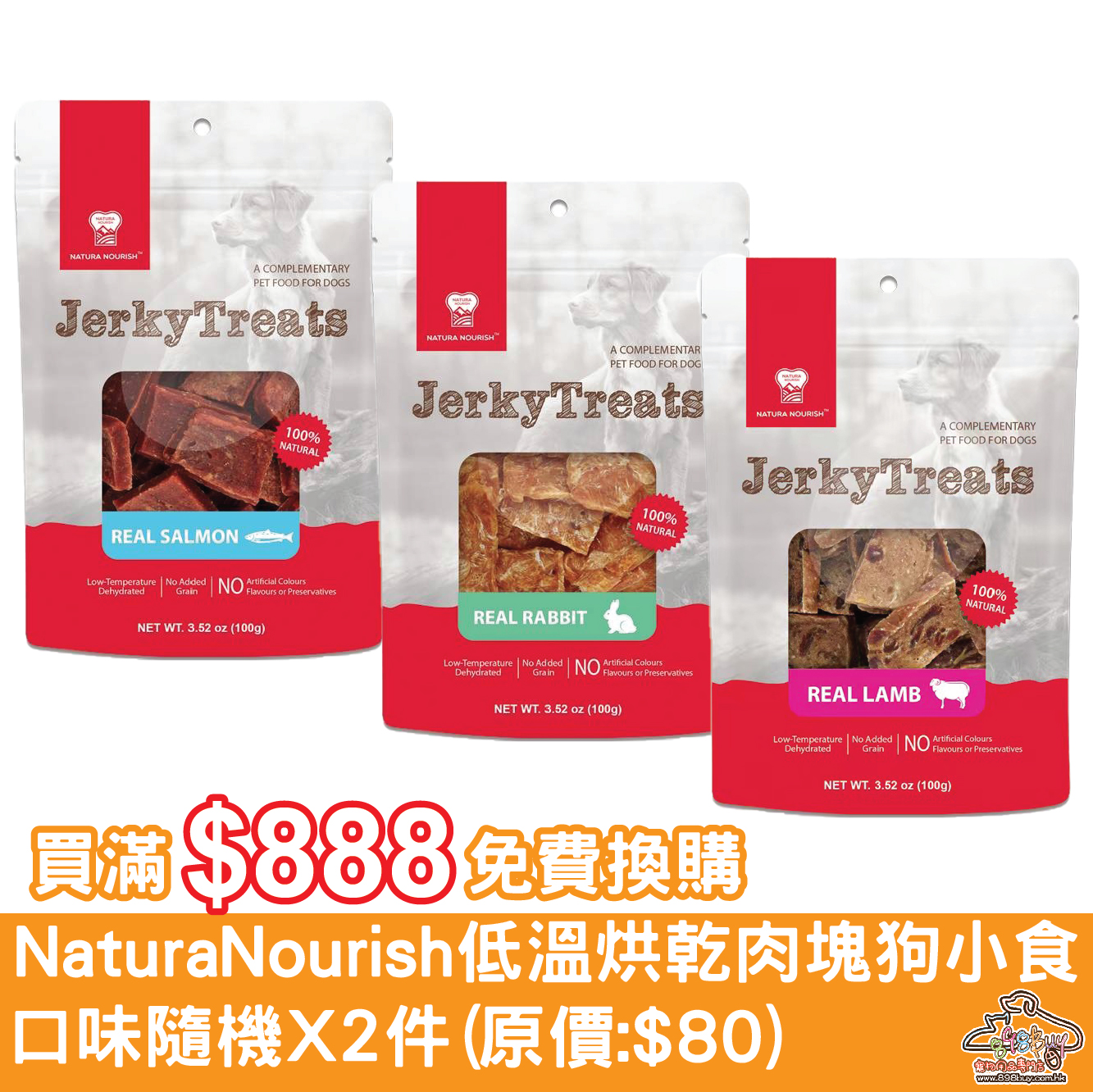 買滿$888免費換購 NATURA NOURISH JerkyTreats 全天然低溫烘乾肉塊狗小食 100g (隨機口味2款)