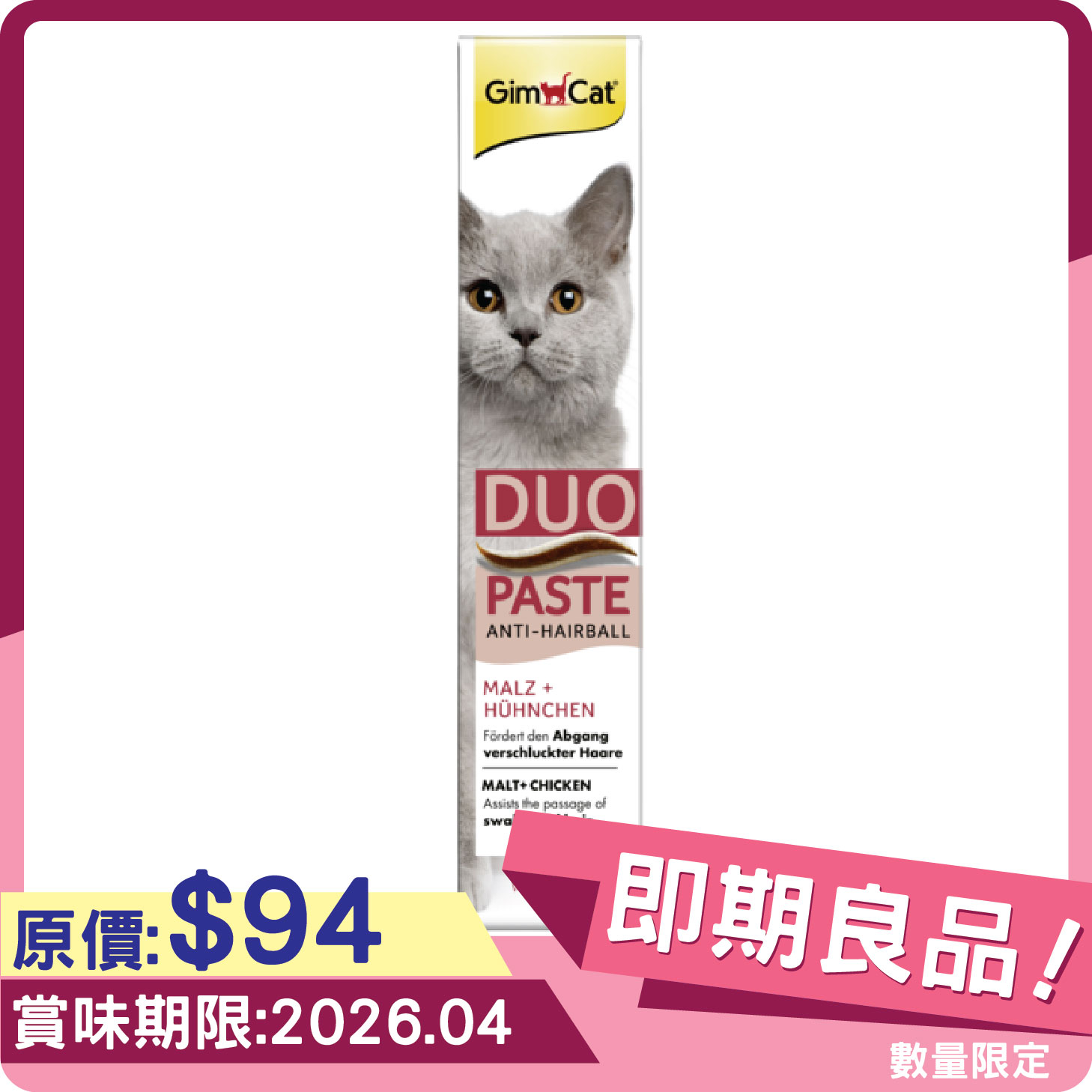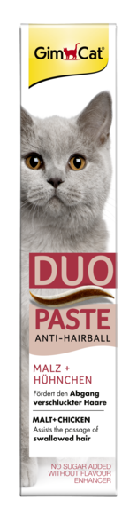 GimCat Duo-Paste 去毛球膏是由麥芽和雞肉搭配的健康美味組合,具有雙重優勢:所選成分麥芽、油和纖維可促進自然排出吃進去的毛髮。