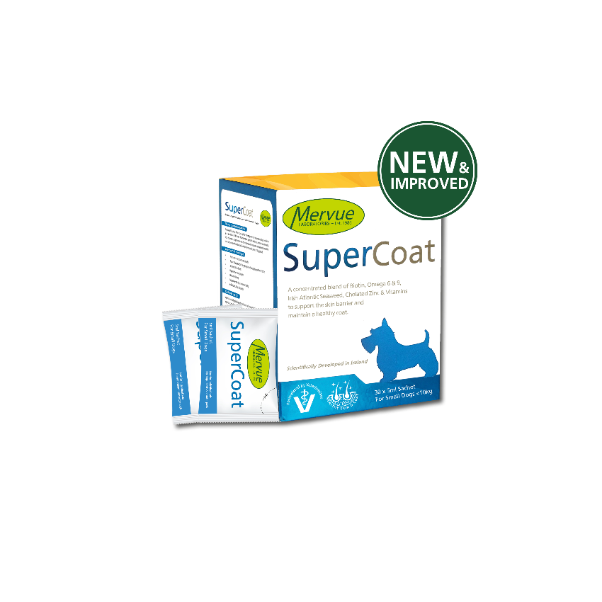 SuperCoat 是一種由獸醫配製的濃縮混合物,包含生物素、Omega 6 和 9、愛爾蘭大西洋海藻、螯合鋅和維生素,可支持皮膚屏障並維持健康的皮毛。