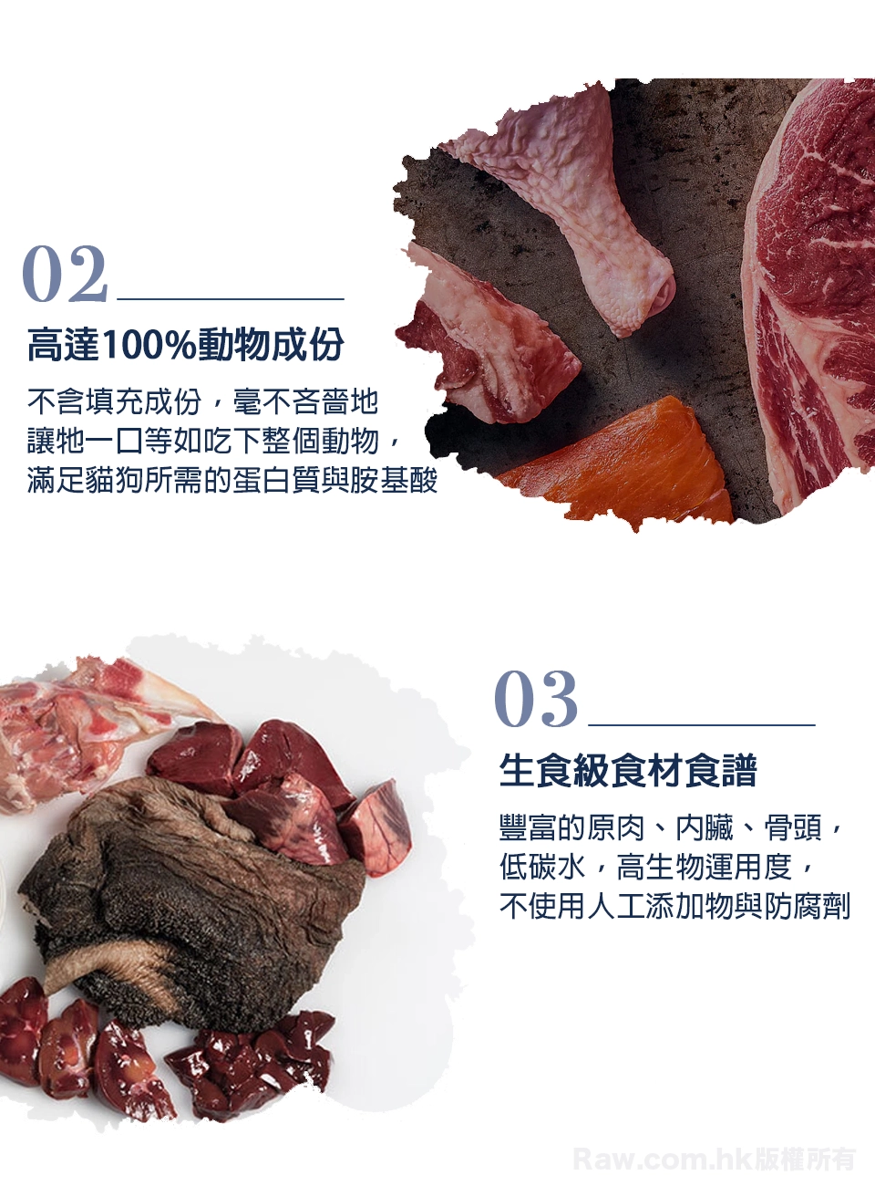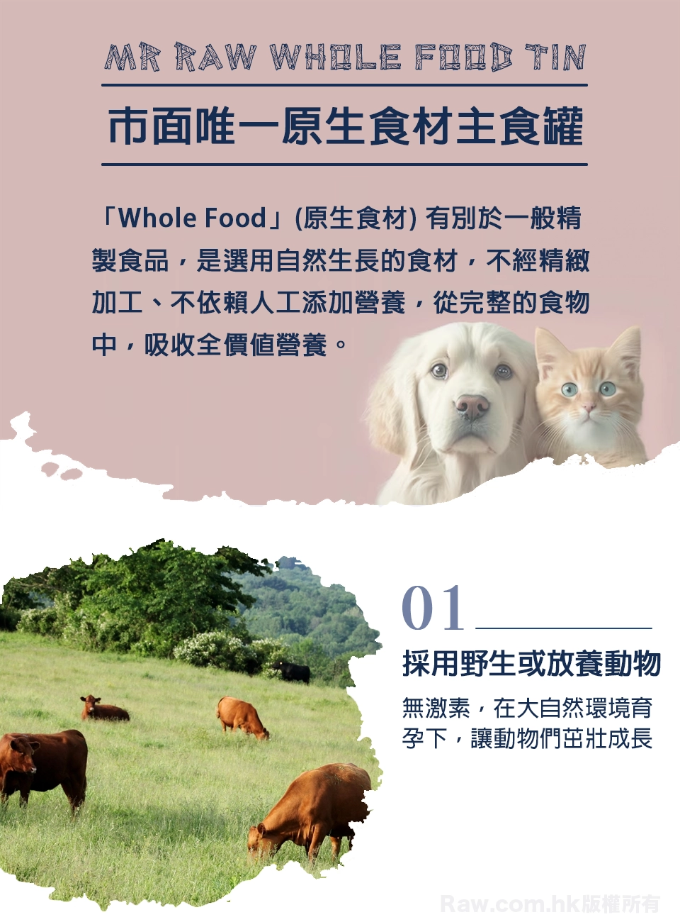 Mr Raw罐頭有別於一般主食罐,Mr Raw原生罐採用高達100%的動物成份(一般為70%~96%),而且做到真正無膠、無添加、無防腐劑,營養100%來自食物本身。