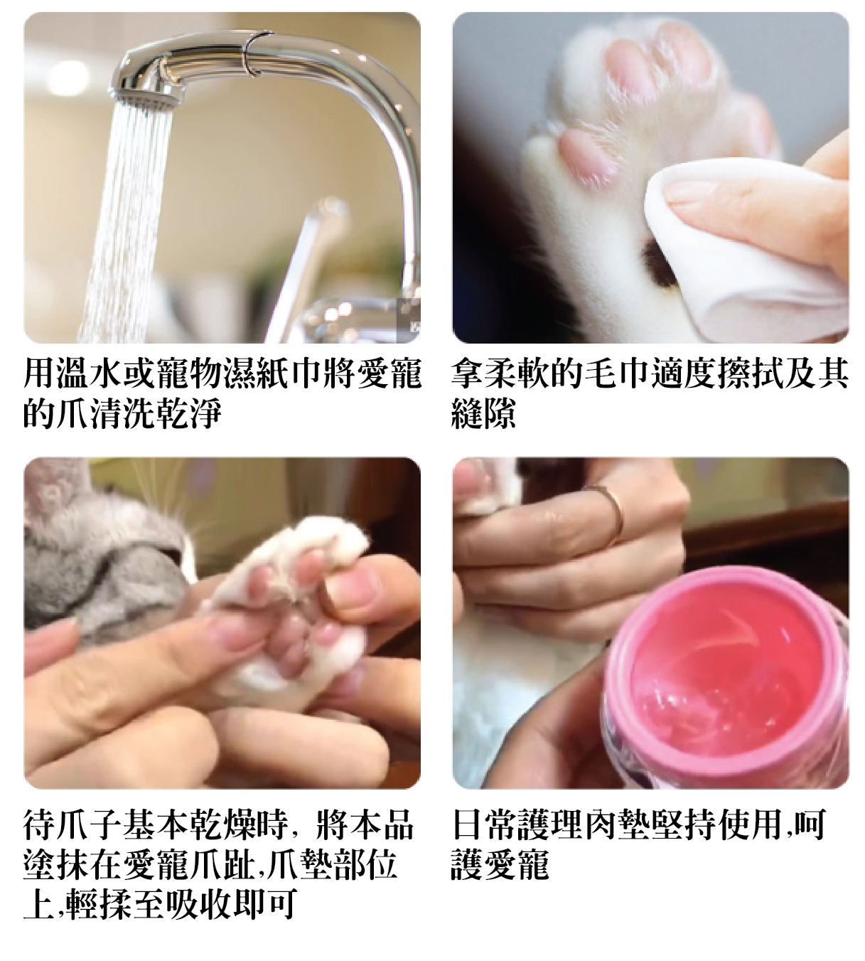 3.待爪子基本乾燥時, 將本品塗抹在愛寵爪趾,爪墊部位上,輕揉至吸收即可
