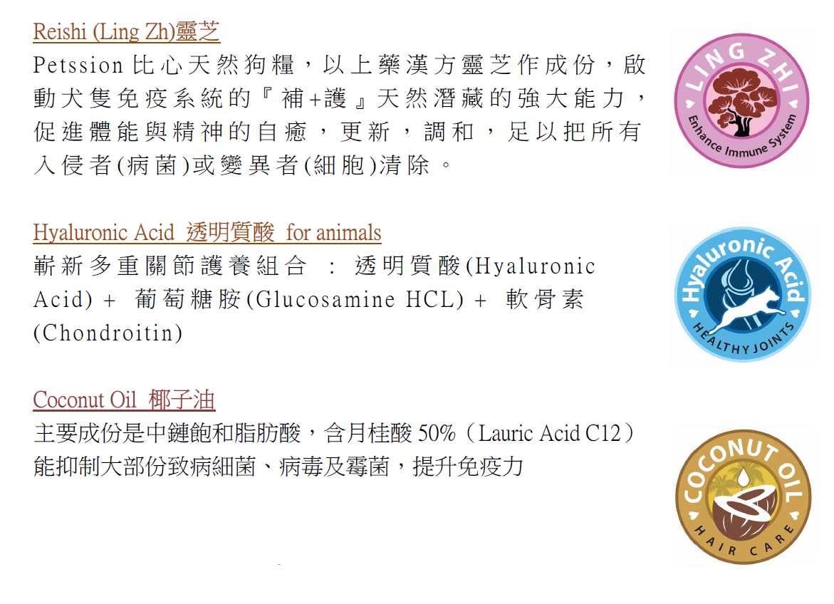 Petssion (比心)寵物食品是以「以心比心」為理念,美國製造的,比心寵物食品有無穀物配方,更添加了透明質酸、靈芝、椰子油、絲蘭等獨特超級食物成分,制造非一般天然成份的尊貴寵物食品,提供寵物完整而均衡的營養。以靈芝啟動身體免疫力,配以椰子油的天然月桂酸牽動內外調諧力,加上以透明質酸為首的多重關節修護原素運動肢體活力。符合AAFCO標準,強調高質量監控,有乾糧與主食罐,適合不同年齡的貓狗,提供雞肉、三文魚等多種口味,旨在提升寵物健康與幸福感。