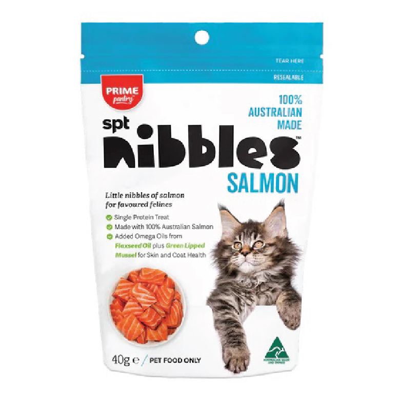Prime Pantry 出品的 Nibbles 鮭魚貓零食,是貓咪理想的訓練輔助品。產自澳大利亞,採用單一蛋白質來源-100% 澳洲人類食用級鮭魚。