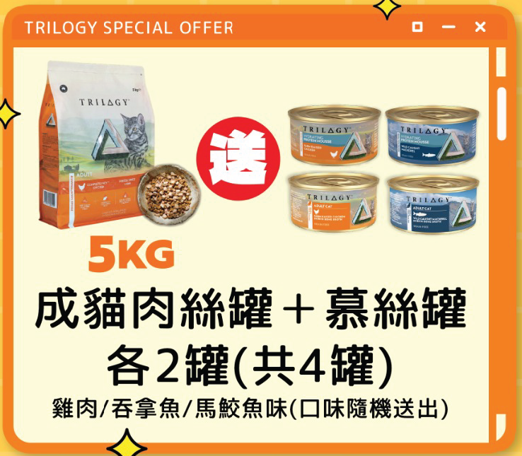 凡購買 Trilogy澳洲雞肉及羊肺貓糧,即可免費換領 "Trilogy 補水貓罐罐" 4件 (只限5KG)