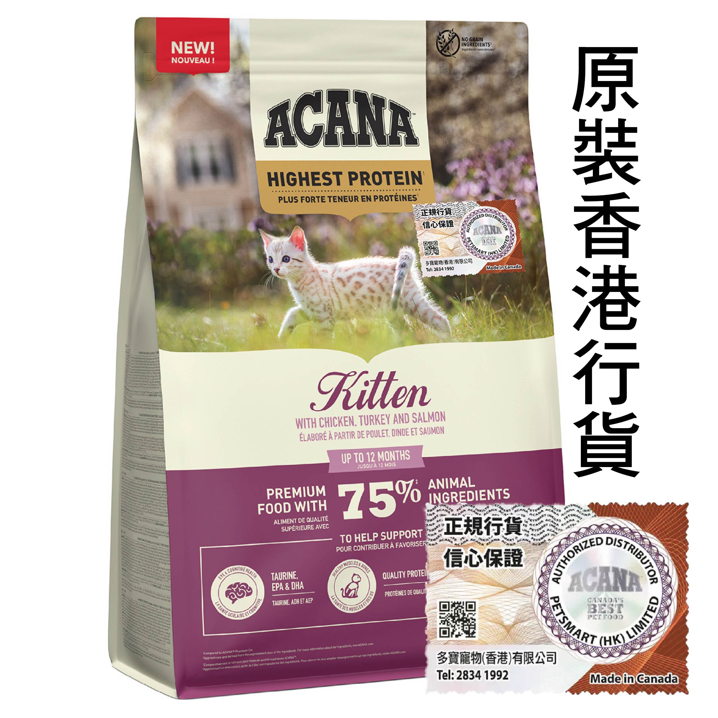 ACANA™ 高蛋白幼貓配方,富含動物蛋白,呵護您愛貓的成長。