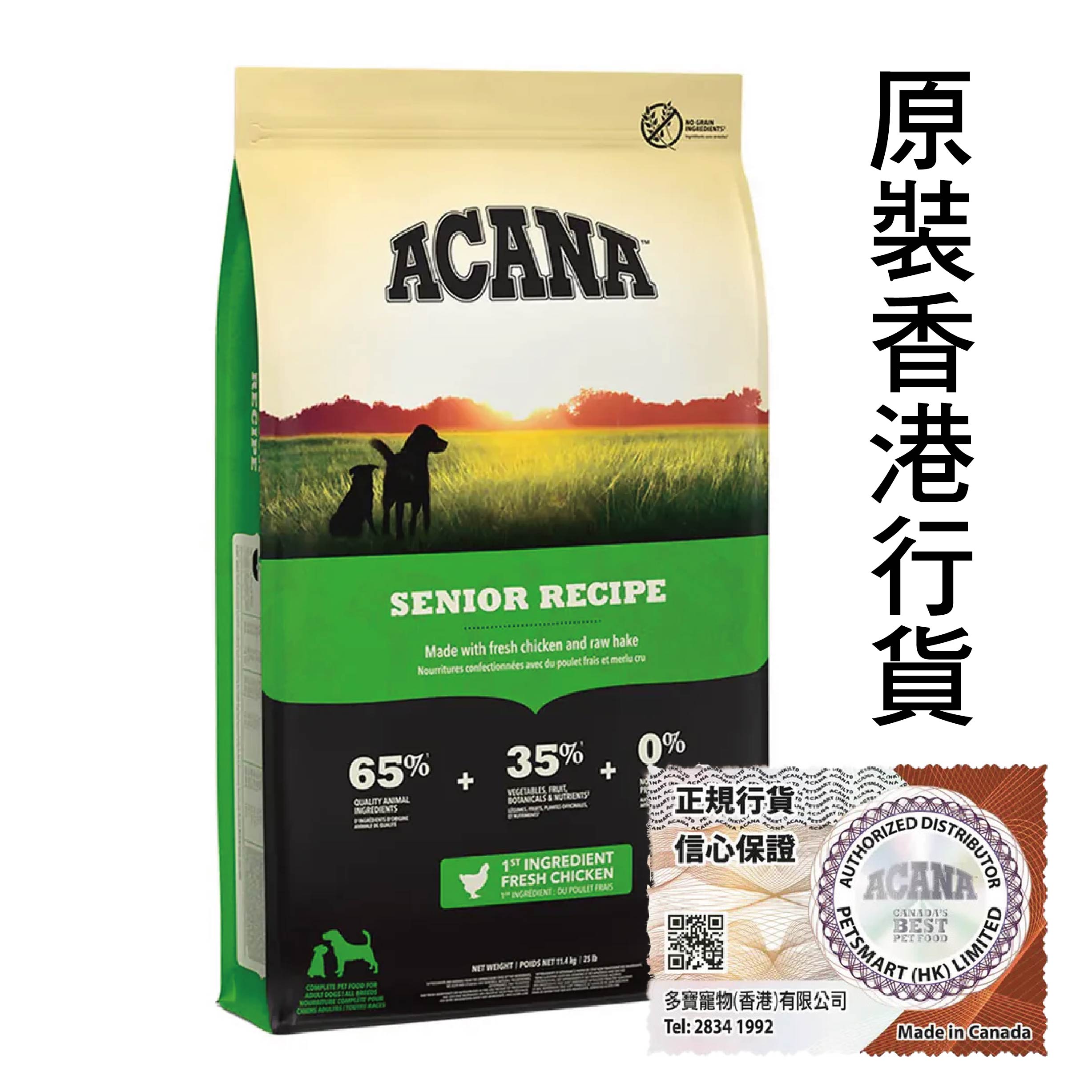 ACANA Senior Dog 愛肯拿老犬飼料,65% 肉含量,使用放養雞肉、野生捕撈魚獲與巢蛋,豐富多樣的動物蛋白質來源。