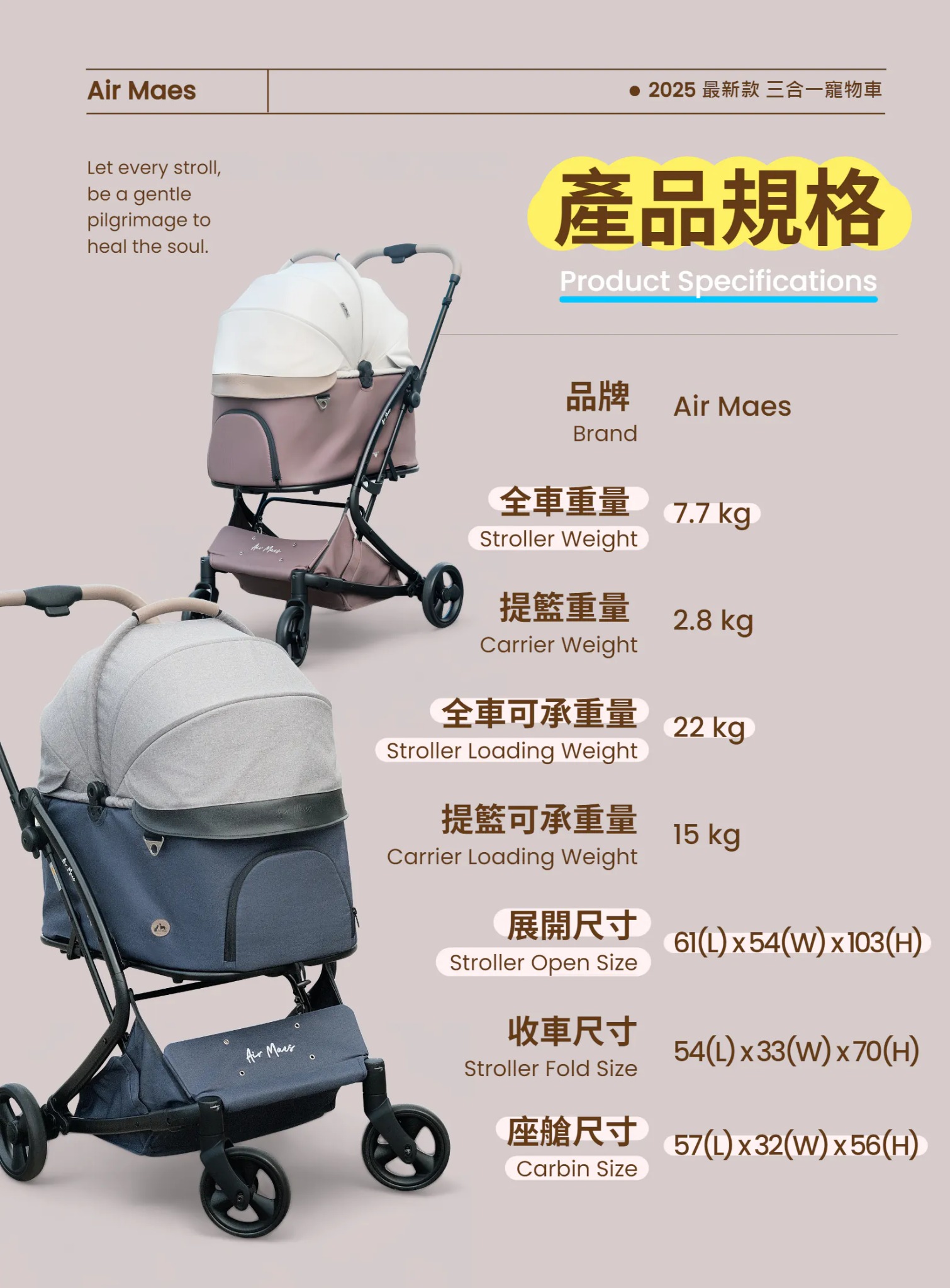• 全車減震設計:配備全車減震系統與前輪360°萬向旋轉,提供平穩順暢的推行體驗。