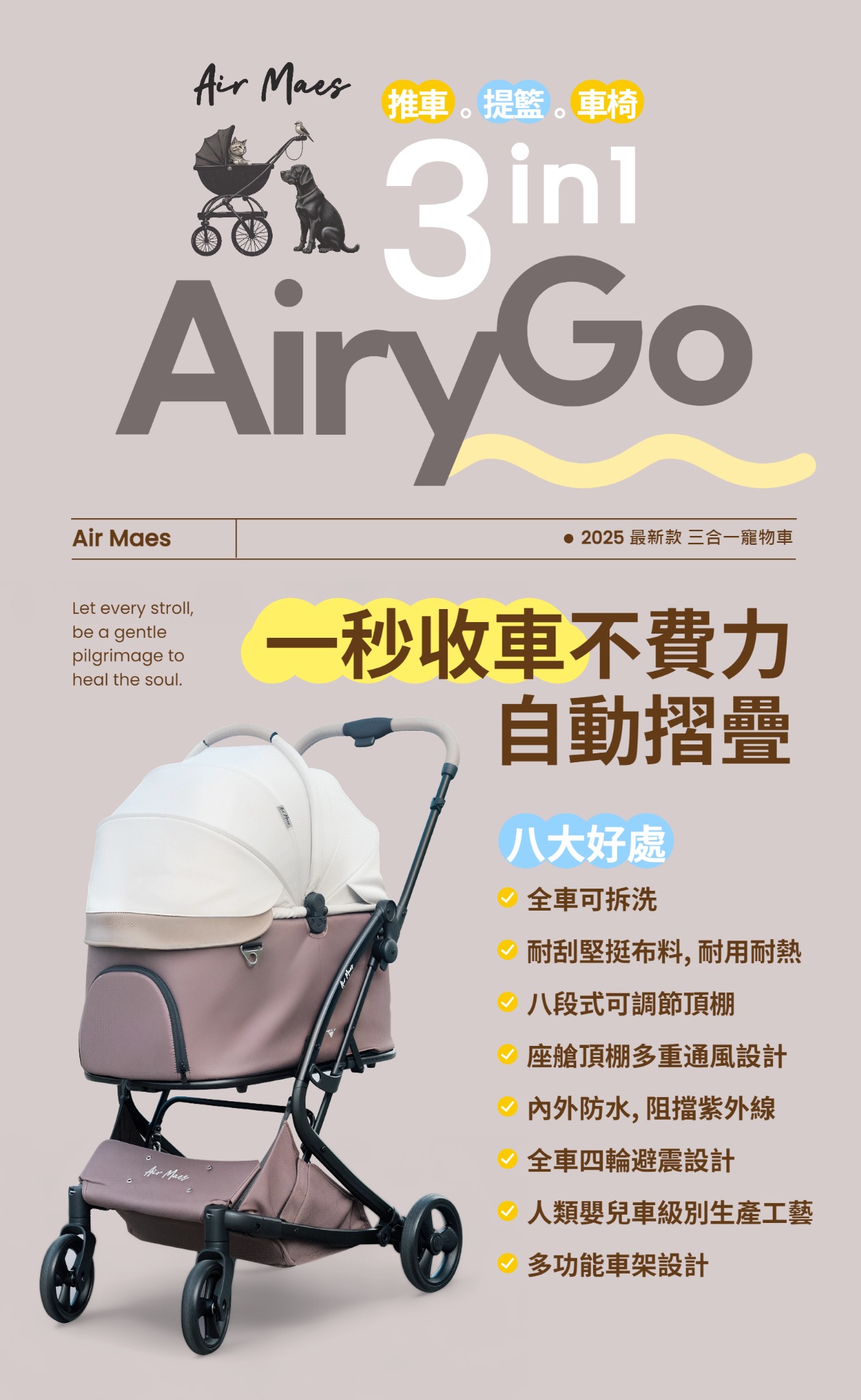 Air Maes Airy GO 3合1 收摺寵物推車 (摩卡奶油卷) 是一款專為寵物家庭設計的多功能推車,集推車、寵物汽車座椅、提籃於一身,滿足多種出行需求。這款寵物推車以其一秒自動摺疊功能脫穎而出,簡單一按即可輕鬆收車,無需拆卸提籃,極大地方便了使用者。其設計符合歐盟嬰兒車安全級別EN 1888標準,確保您的寵物在任何旅程中都安全舒適。