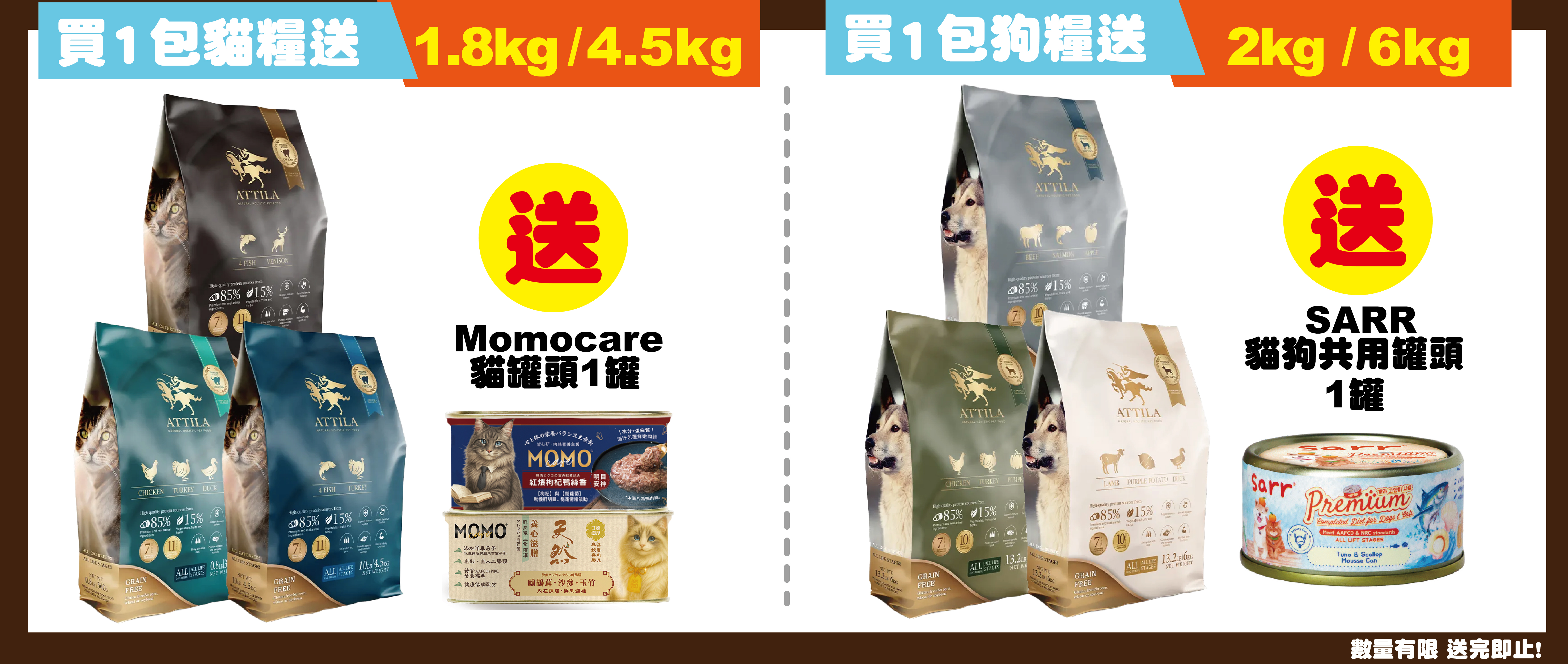 凡購買 ATTILA 阿提拉 貓狗乾糧,即可免費換領 "MOMOCARE/Sarr罐頭" 1件(隨機口味) (任何Attila貓狗乾糧即可)