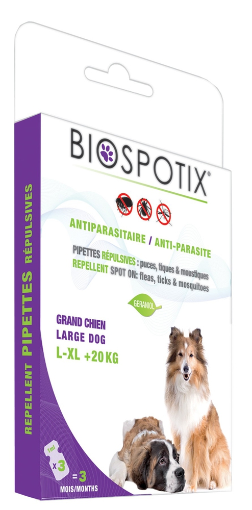 Biospotix大型犬用驅蟲滴管配方中含有香葉醇。它們能使幾丁質、蟲卵和幼蟲脫水,並阻塞有害昆蟲的呼吸道。