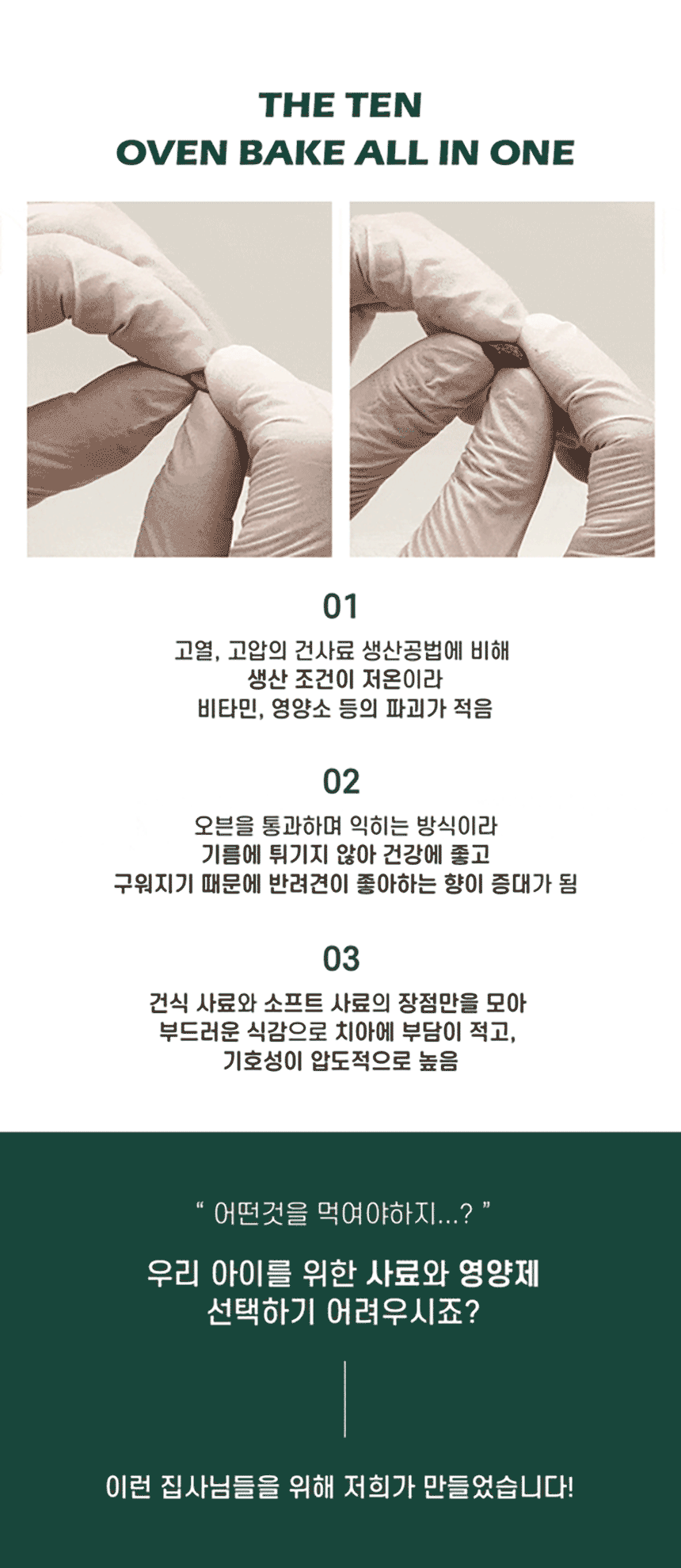 採用75度以下的低溫烘培,大大保留食材的維生素和營養素。結合了乾糧和軟糧的優點,柔軟質地減少了對牙齒的壓力,並且更加適口。