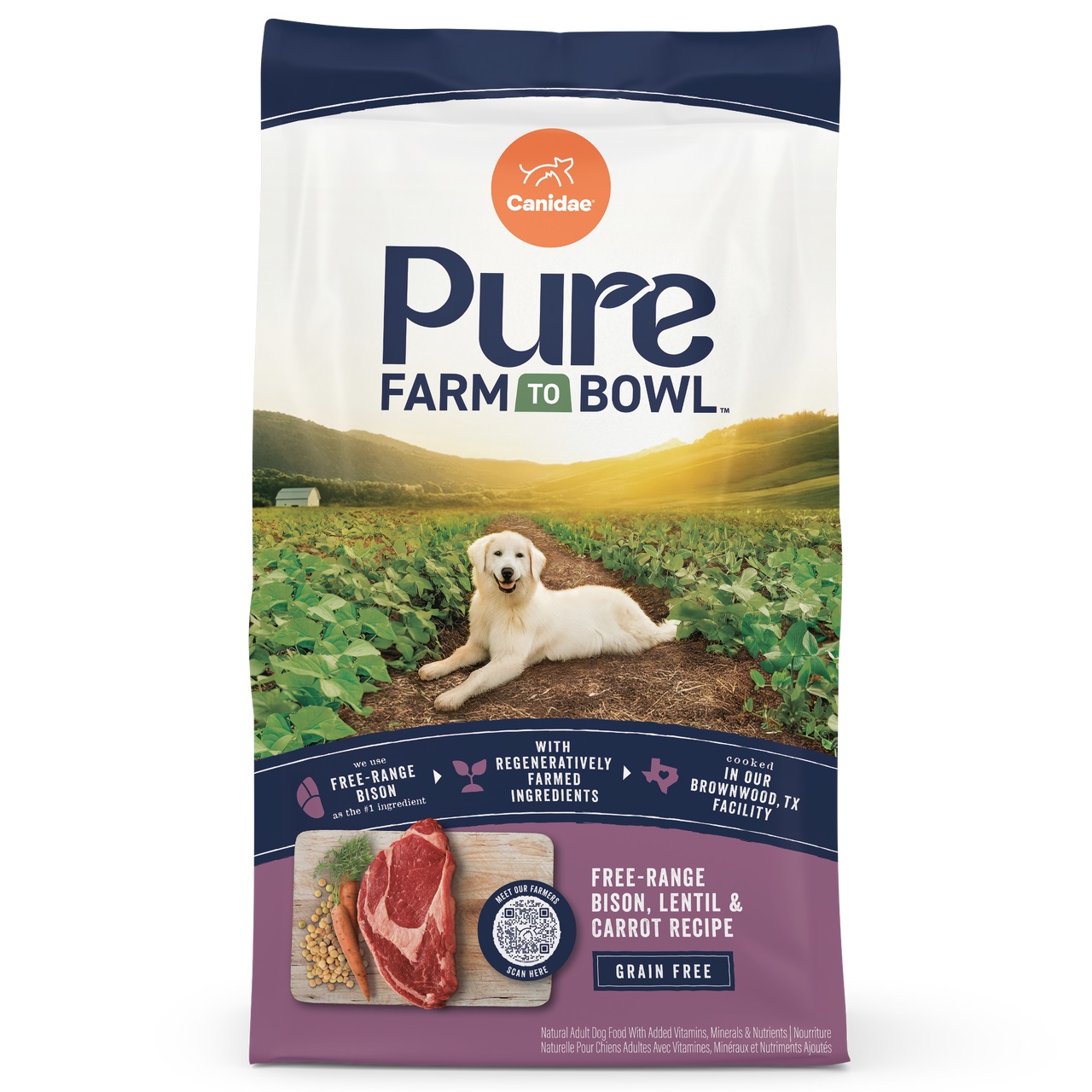 每一包 Canidae Pure Farm to Bowl 都經過全面測試,以確保不含任何有害病原體和毒素,並確認營養成分,從而保證每一口都提供一致的高品質營養。