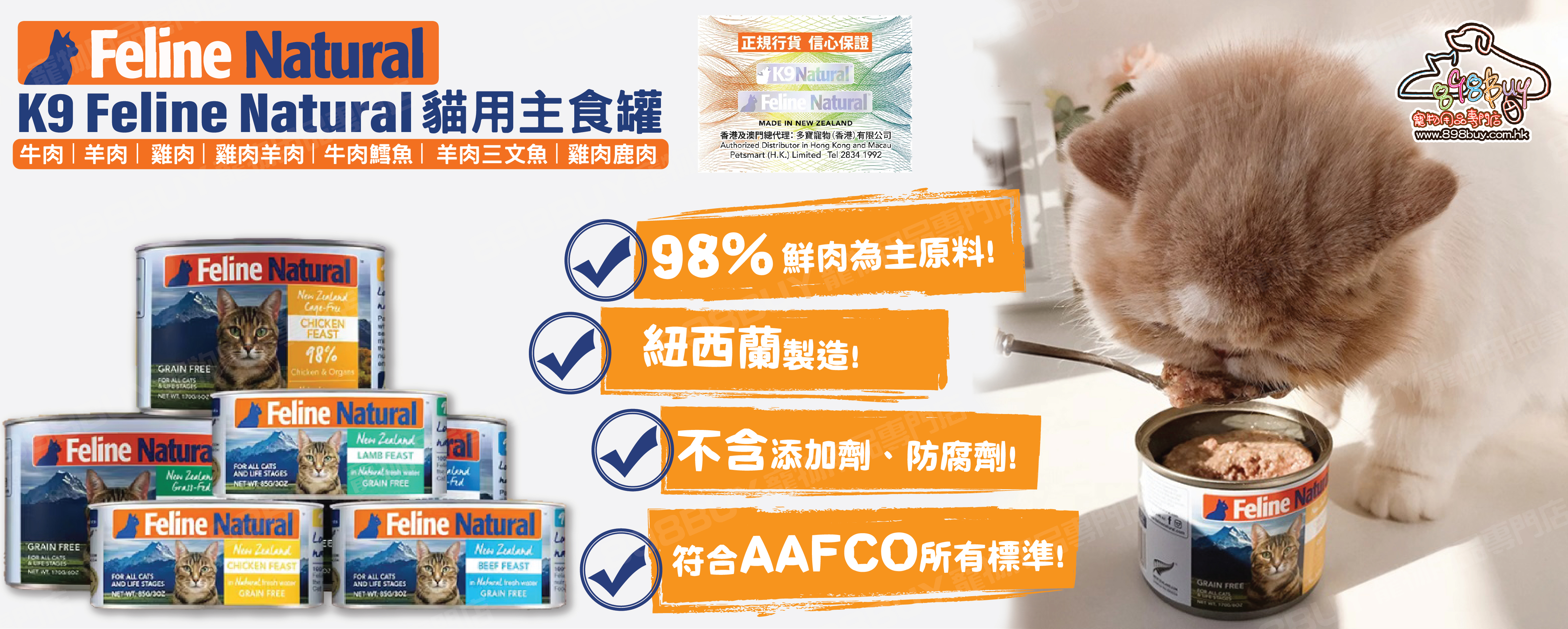 F9 Feline Natural 貓罐頭是源自紐西蘭,貓罐頭高含肉量,是無穀物主食罐,主要特點包括使用草飼、散養的優質肉品(如牛肉、雞肉、羊肉等),並添加紐西蘭綠貽貝等天然成分來支持關節健康。完整均衡的營養,不含人工添加物,適合幼貓至成貓食用,並且強調其水分來自天然新鮮的紐西蘭水。