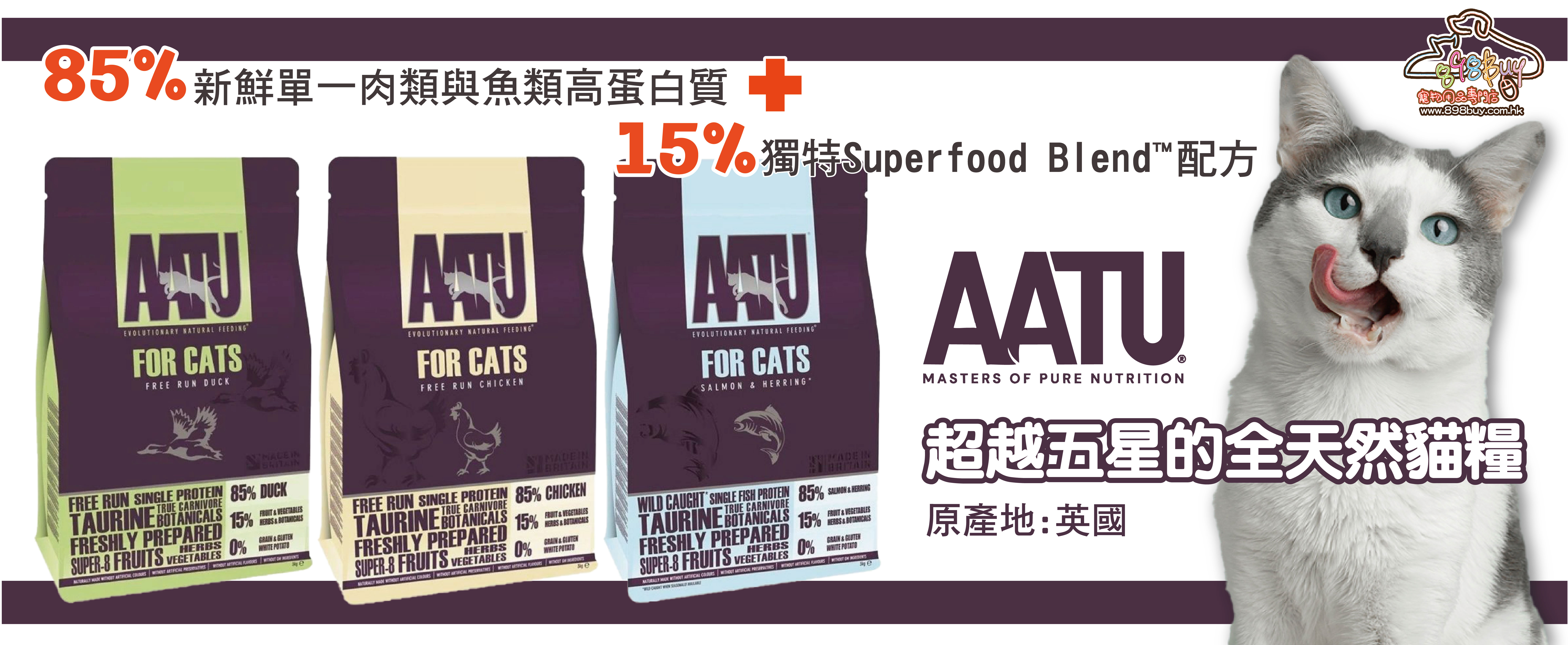 AATU是以85%單一新鮮肉類提供優質蛋白質,單一肉類的蛋白質容易被貓犬身體所吸收,而且能有效避免出現腸胃敏感或皮膚敏感症狀。配合15%精心調配Super8獨有配方,當中由8種蔬菜、8種水果、8種香草及8種香料和草本植物組成。蘊含豐富的維他命、益生菌、益生元及坑氧化物。為現今的犬隻提供平衡而充足的營養飲食餐單。配方均採用新鮮肉製成,然後採用AATU獨特的‘low and slow’™方法烹製,這有助於確保動物蛋白質的有效消化。所有的產品都是小批量手工製作,不含穀物、白薯或麩質。