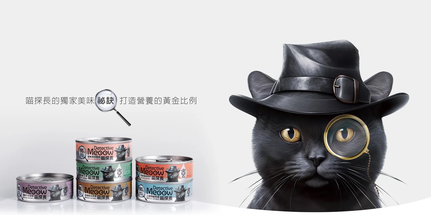貓咪喜歡的只有貓咪最懂,喵探長團隊從貓咪對食物的口感/口味/質地中分析,使用天然健康的人食等級食材與昂貴珍稀的獨家配方,打造出高適口性的貓咪主食罐,讓貓咪吃得開心