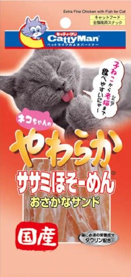 雞肉條、加工魚肉、糖、甘油、山梨糖醇、抗氧化劑(異抗壞血酸鈉、亞硫酸鈉)、礦物質(鈉)、磷酸鹽(鈉)、調味料、防腐劑(山梨酸鉀)、牛磺酸、固色劑(亞硝酸鈉)。