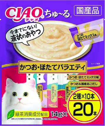 • 單份份量的液體零食。可舔食,是小貓和老年貓容易食用的零食。多種包裝,讓您享受兩種不同的口味。