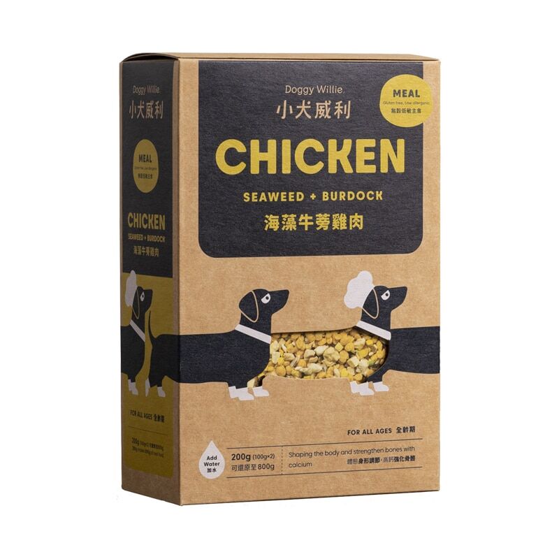 台灣產去皮雞胸肉、新鮮馬鈴薯、新鮮番薯、新鮮南瓜、非基改豆腐、新鮮牛蒡、新鮮海藻、新鮮木瓜、新鮮芹菜、牛奶鈣、亞麻仁籽萃取物(Omega-3)、綜合維生素礦物質