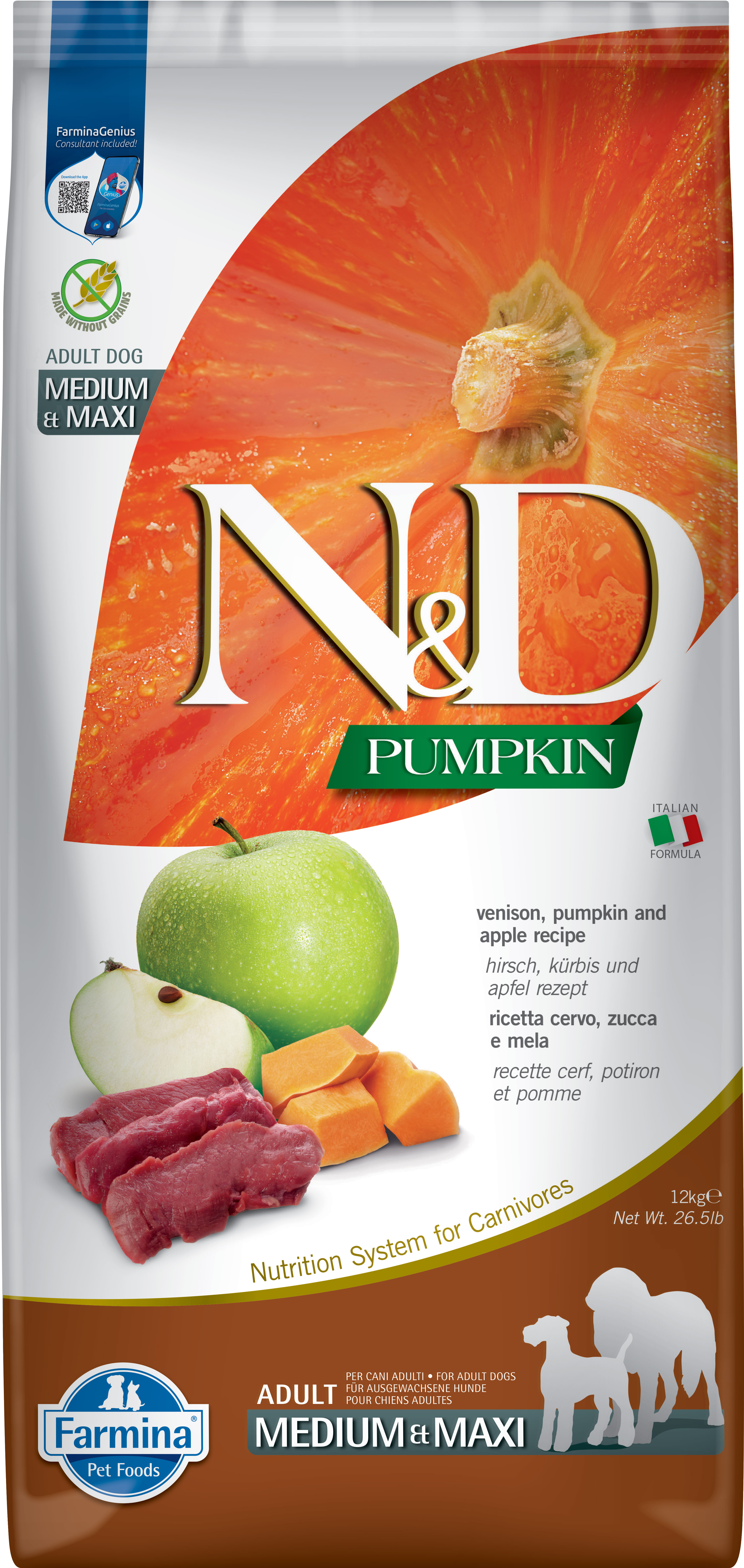 N&D 天然南瓜無穀系列,不使用任何穀物,以96%動物來源的高品質蛋白質,搭配具有高度營養價值的南瓜製作而成。本配方旨在滿足美國飼料管理協會 (AAFCO) 制定的犬糧營養標準中規定的維持營養水準。