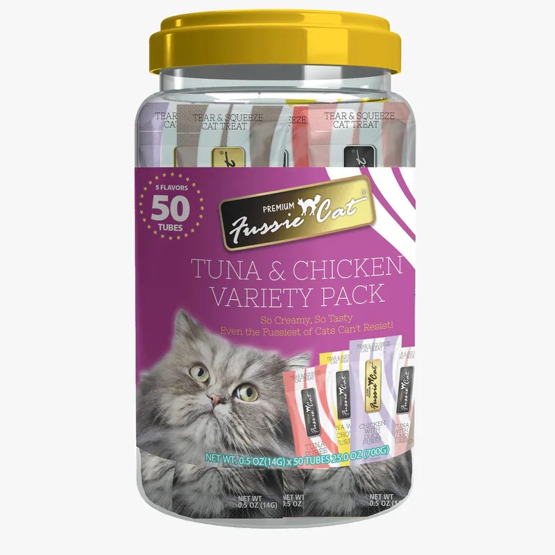 Fussie Cat 貓小食 無穀物天然肉醬 5款吞拿魚及雞肉口味 (14g*50條 過癮桶裝) (紫) (FUP-TC50)