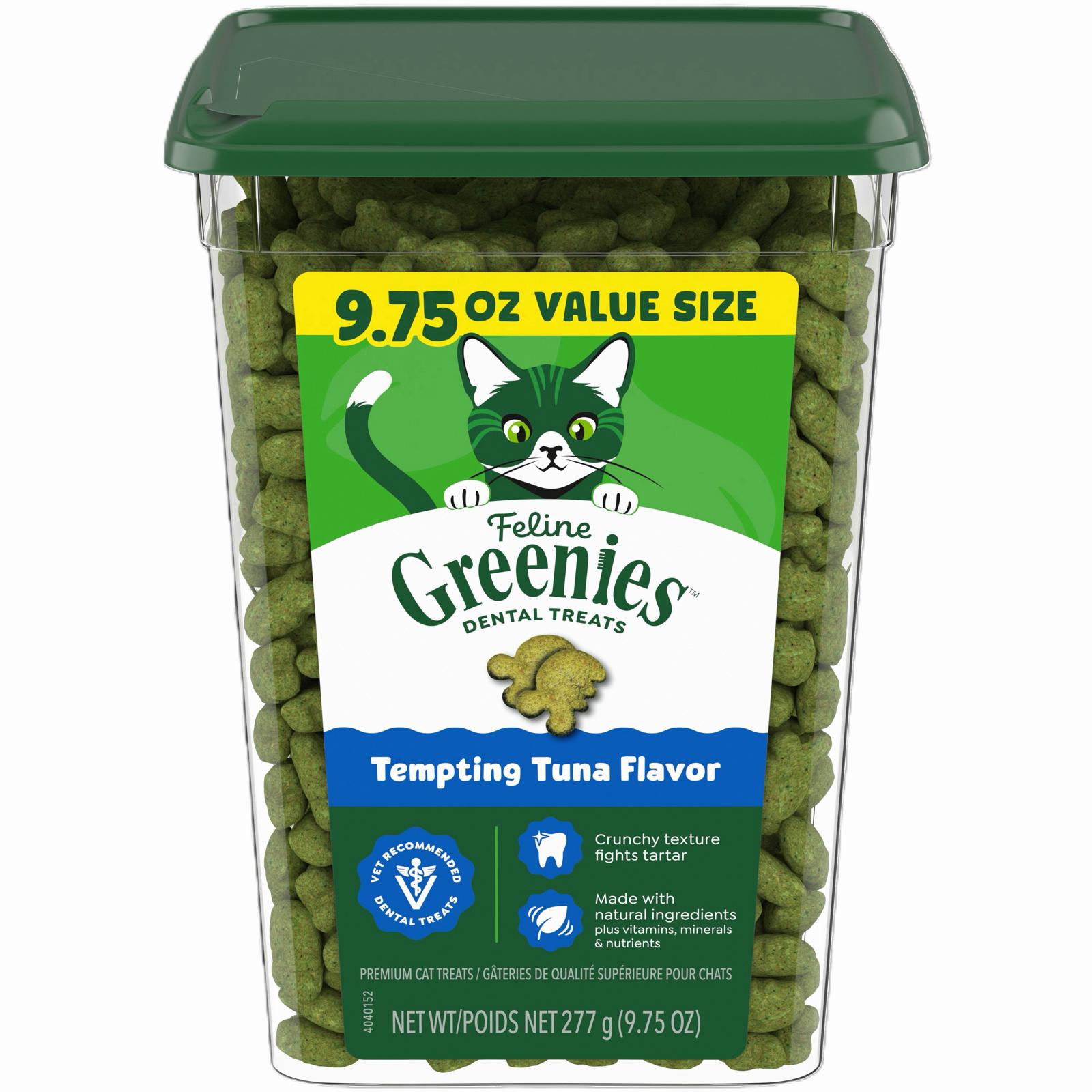Feline GREENIES Dental Treats are formulated for cats 1 year of age or older. For a healthy dental benefit, feed a 10 lb adult cat 8 treats, two times per day in conjunction with your cat's regular diet. Adjust the amount of main meal to compensate for calories delivered by treats.