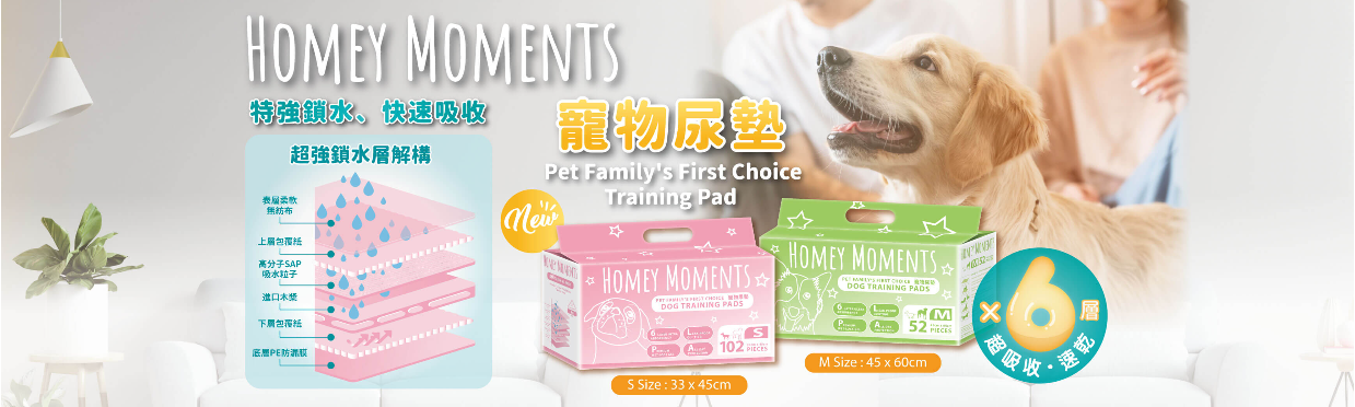 Homey Moments 6層鎖水寵物尿墊使用進口木漿。6層鎖水構造。四邊防漏設計。鎖水力強、快速吸收、無香味。