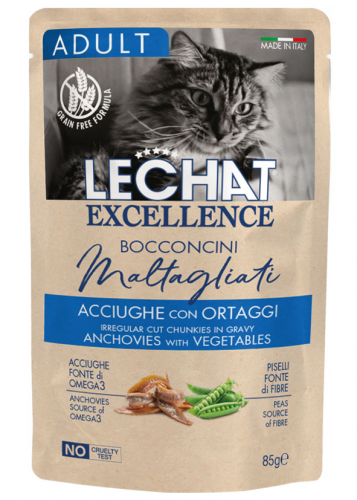 Le Chat Excellence 成貓小鯷魚蔬菜貓糧是一款營養全面均衡的成貓食品。不規則切塊的貓糧塊浸潤在濃鬱的肉汁中,精選豌豆等非穀物類碳水化合物來源,以及富含omega-3脂肪酸的小鯷魚,旨在呵護愛貓的健康,幫助保持亮澤的毛髮。義大利製造,無動物實驗,不添加色素及人工防腐劑。