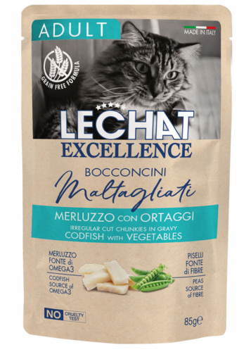 Le Chat Excellence 成貓鱈魚蔬菜配方是一種營養全面均衡的成貓食品。不規則切塊的肉塊浸潤在濃鬱的肉汁中,精選豌豆等非穀類碳水化合物來源和富含蛋白質的鱈魚,幫助愛貓保持健康體型。 Le Chat Excellence 義大利製造,不進行動物實驗,不添加色素和人工防腐劑。