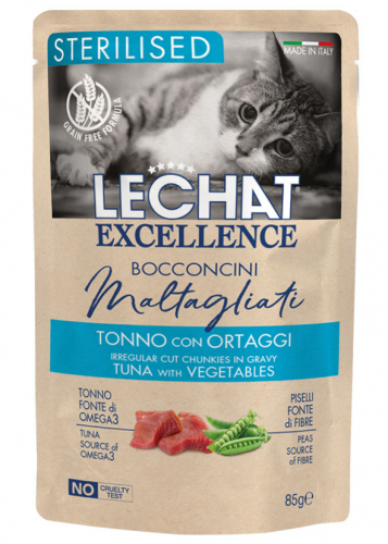Le Chat Excellence 絕育貓鮪魚蔬菜貓糧是一款營養全面均衡的成貓食品。這款貓糧採用不規則切塊的肉汁,精選豌豆等非穀物類碳水化合物來源,並添加富含omega-3脂肪酸的金槍魚,專為絕育貓的健康而設計,有助於保持貓咪毛髮亮澤。義大利製造,無動物實驗,不添加色素及人工防腐劑。