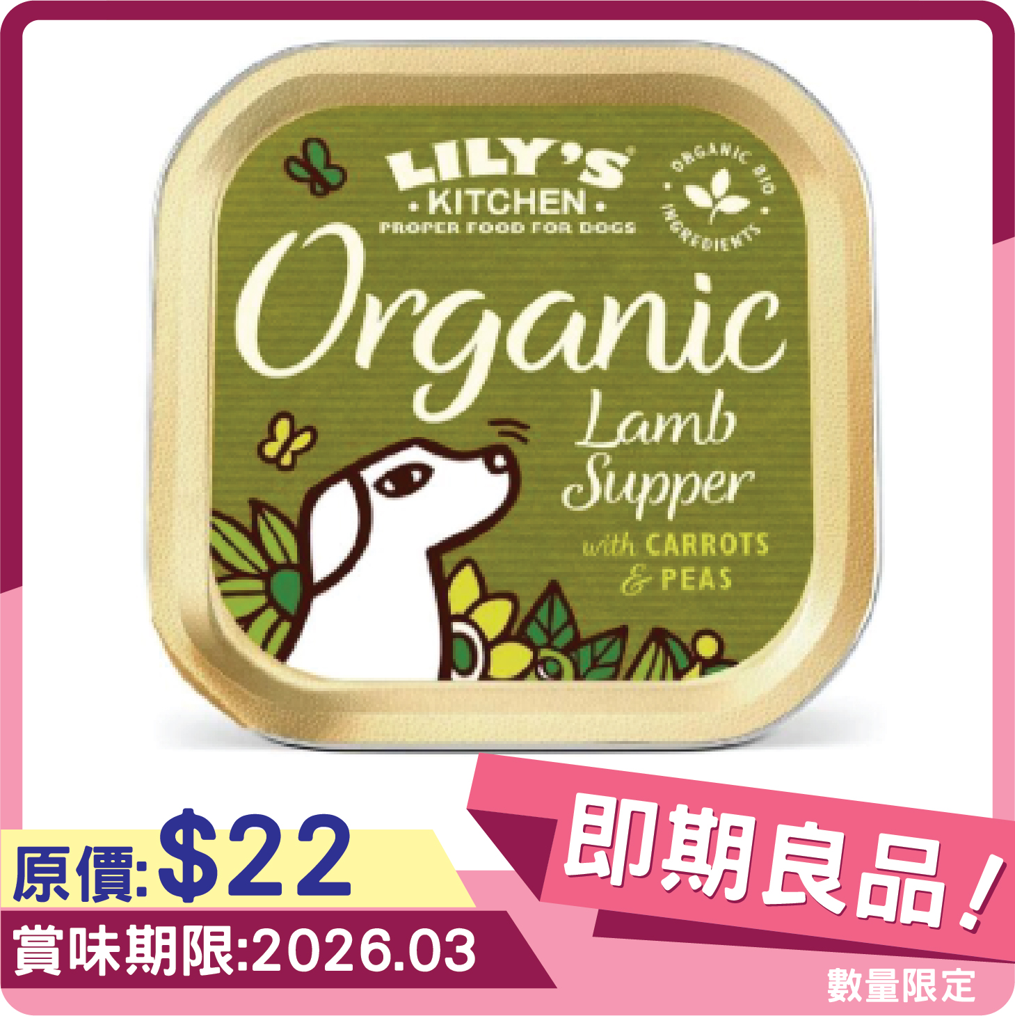 僅由有機、有益健康的原料製成的美味完整均衡食譜:新鮮烹製的羊肉、牛肉、豬肉和雞肉,混合胡蘿蔔和豌豆。