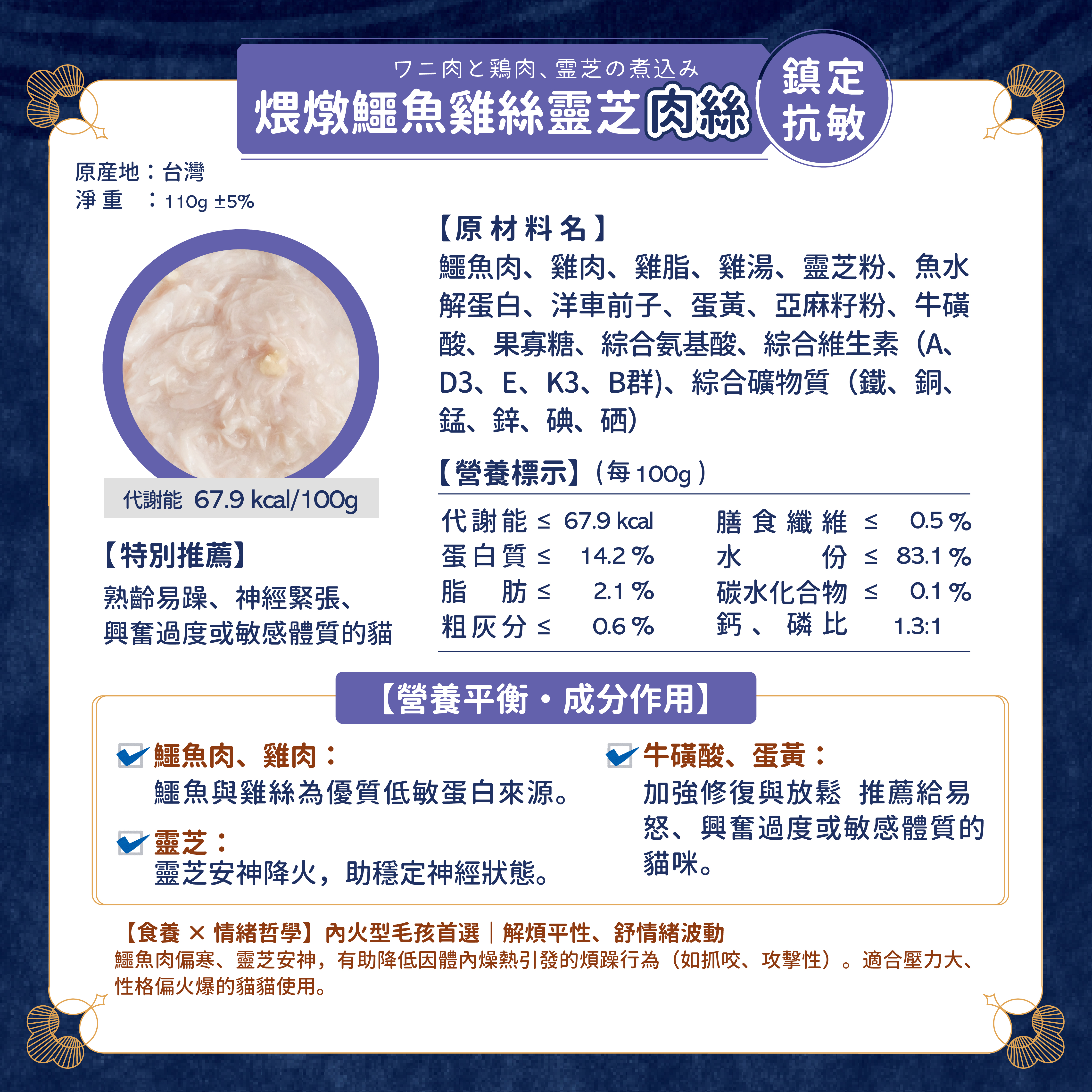 成分:鱷⿂⾁、雞⾁、雞脂、雞湯、靈芝粉、魚水解蛋白、洋車前子、蛋黃、亞麻籽粉、牛磺酸、果寡糖、綜合氨基酸、綜合維生素(A、D3、E、K3、B群)、綜合礦物質(鐵、銅、錳、鋅、碘、硒)