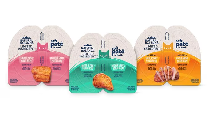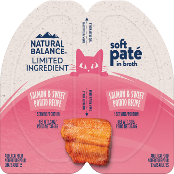 Natural Balance 三文魚甜薯肉醬滋味杯提供兩份營養均衡的完整膳食,適合成年貓咪食用。