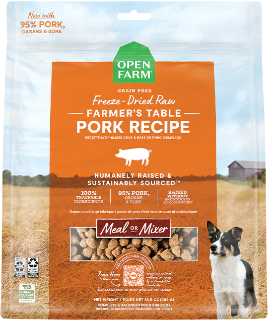 豬肉 , 豬心 , 豬肝 , 碎豬骨 , 有機藍莓 , 有機胡蘿蔔 , 有機南瓜 , 有機葵花籽 , 有機菠菜 , 有機羽衣甘藍 , 有機南瓜子 , 有機蔓越莓 , 有機胡蘆巴種子 , 蒙脫石粘土 , 非轉基因椰子油 , 三文魚油 , 菊苣 , 乾海帶 , 有機蘋果醋 , 維生素 D3 補充劑 , 維生素E補充劑 , 硫胺素單硝酸鹽 , 葉酸 , 氯化膽鹼 , 鋅氨基酸螯合物 , 銅氨基酸螯合物 , 硒酵母 , 薑黃 , 肉桂 , 混合生育酚(一種天然防腐劑)