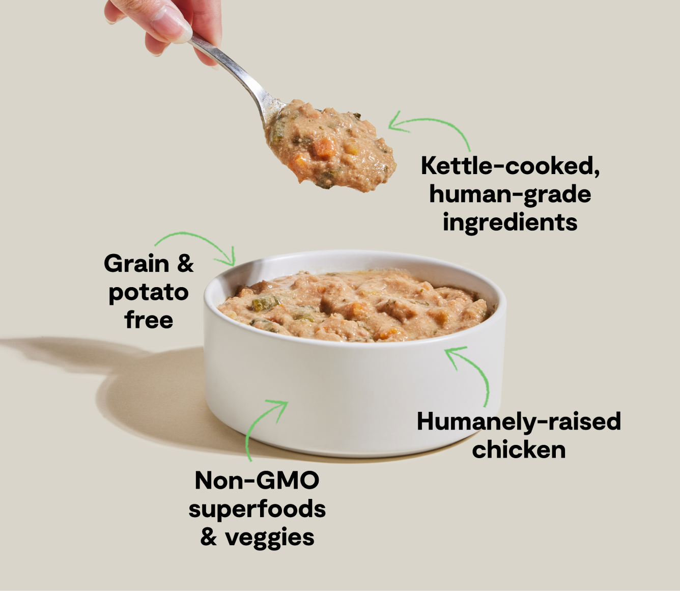 為狗狗的碗裡添上美味的雞肉塊,以及非基因改造超級食品和蔬菜——所有食材均為人類等級,經過完美烹調。將這道多汁的鄉村燉菜與您的愛犬餐點混合,以最大限度地提高營養,或單獨食用,打造完整均衡的膳食。不含穀物和馬鈴薯。