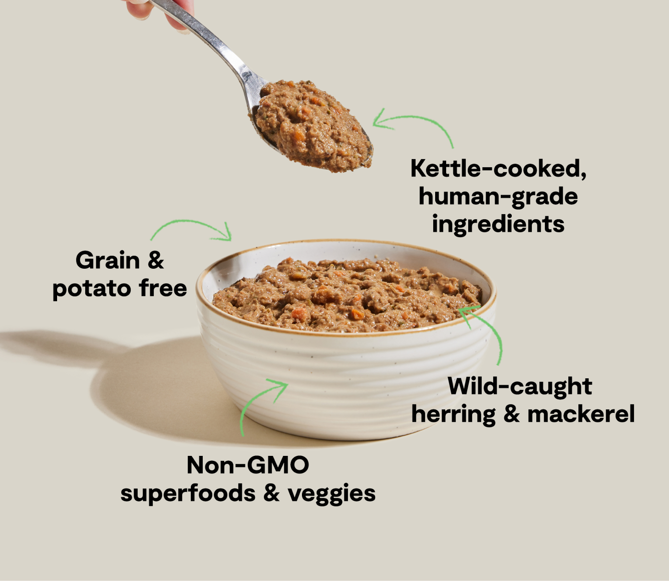 為狗狗的碗裡添上美味大塊的Ocean Wise(全球性環保慈善海洋保育組織)推薦的野生鯡魚和鯖魚,以及非基因改造超級食品和蔬菜——所有食材均為人類級別,經過完美烹製。您可以將這道多汁的鄉村燉菜與您的愛犬餐點混合,以最大限度地提高營養,也可以單獨食用,作為完整均衡的膳食。不含穀物和馬鈴薯。