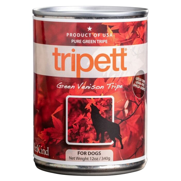 PetKind Tripett 無穀物狗罐頭,含99%純草胃,為狗狗提供Green Tripe的所有好處。鹿肉蛋白質含量高,但熱量和膽固醇含量低。該產品非常適合那些尋求具有多樣化蛋白質來源的綠草胃的愛寵。