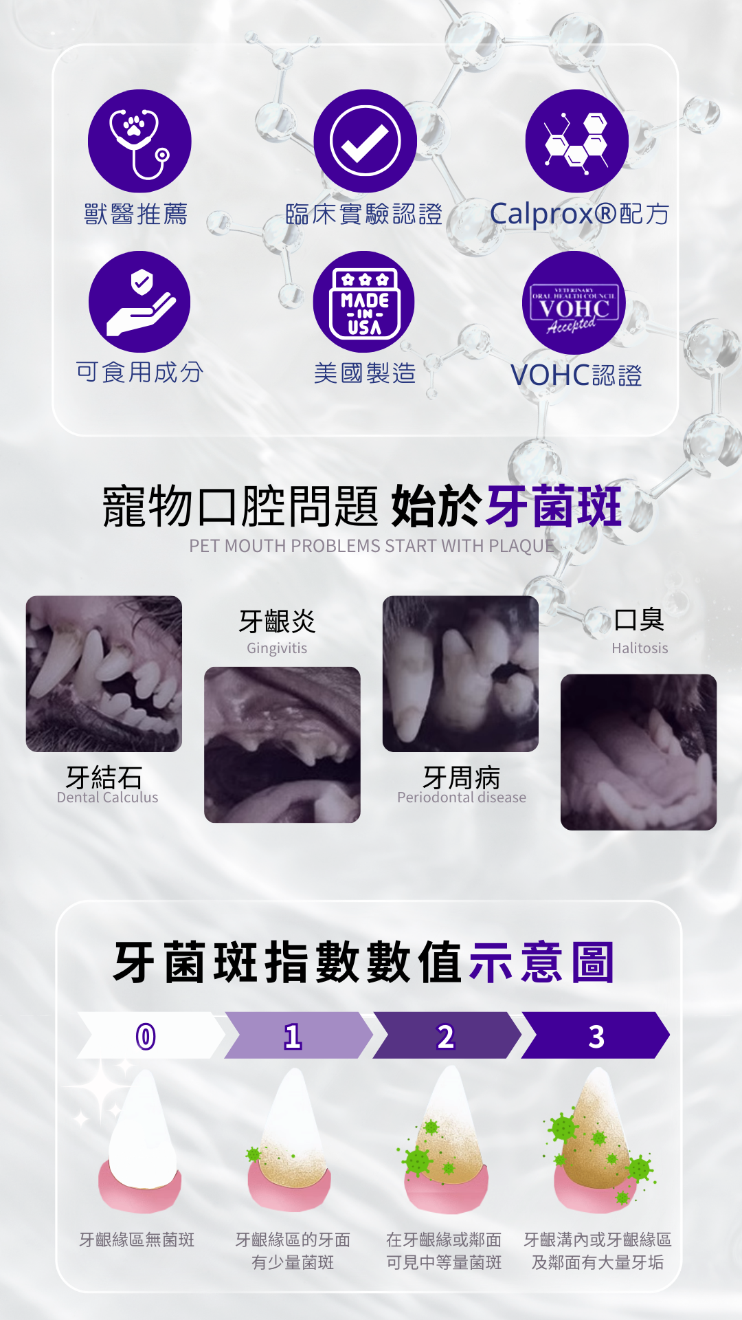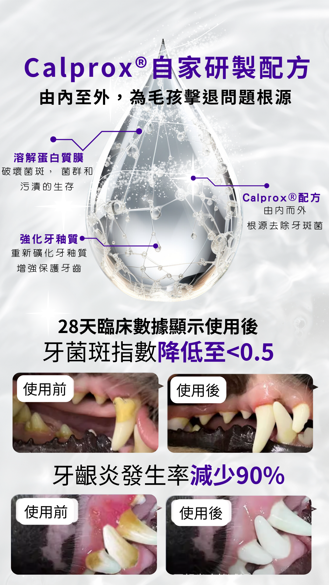 • [ 經臨床證明可抑制牙菌斑、牙垢和牙齦炎] - Petsmile 專有配方 Calprox 經臨床證明,可抑制牙菌斑和牙垢積聚,同時通過輕輕溶解蛋白質晶粒來美白牙齒。 蛋白質顆粒是一種薄的生物膜,形成在牙齒表面上,斑塊、細菌和污漬粘附在其上。 去除顆粒可讓您的寵物的牙齒更乾淨、更白,同時改善牙齦健康並提供可親吻的清新口氣。