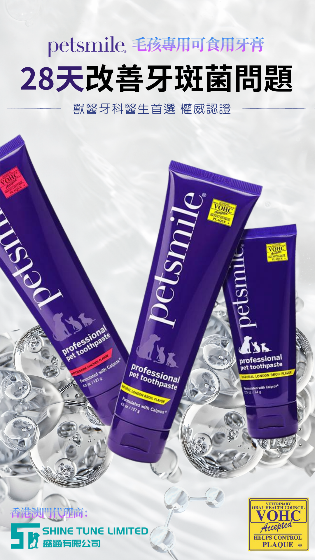 • [獸醫口腔健康委員會接受寵物和狗牙膏] - Petsmile 是唯一 VOHC 推薦給您的寵物使用 Calprox 牙膏。 獸醫選擇Petsmile,因為高品質的成分可以促進白牙和健康的牙齦。 VOHC 認識到 Petsmile 符合寵物口腔健康的最高標準。 每天使用 Petsmile 牙膏和刷牙會顯著改善寵物的口腔健康。
